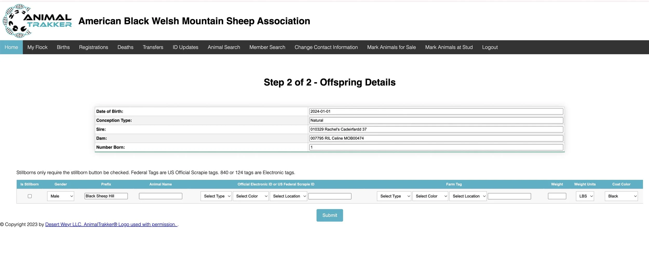 If the lamb was stillborn, just check the stillborn box and click submit.